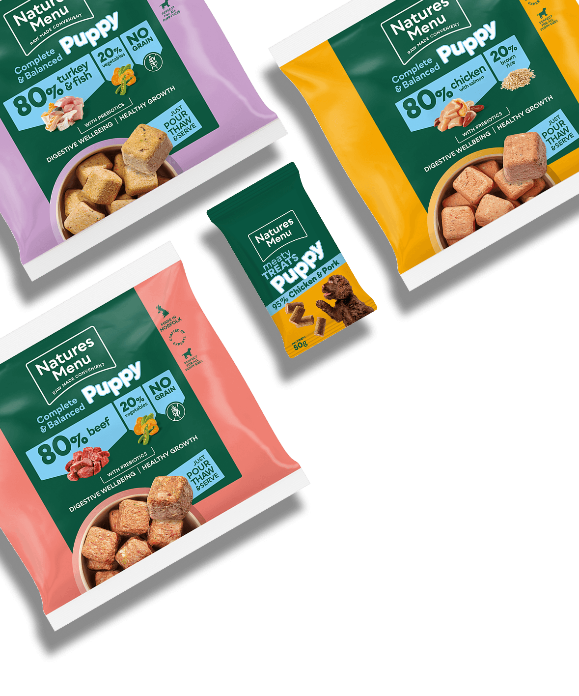A wider variety for growing puppies Includes 2 raw recipes plus meaty treats Lasts a 6 month puppy expected to reach 20kg around 7 days (see pack)