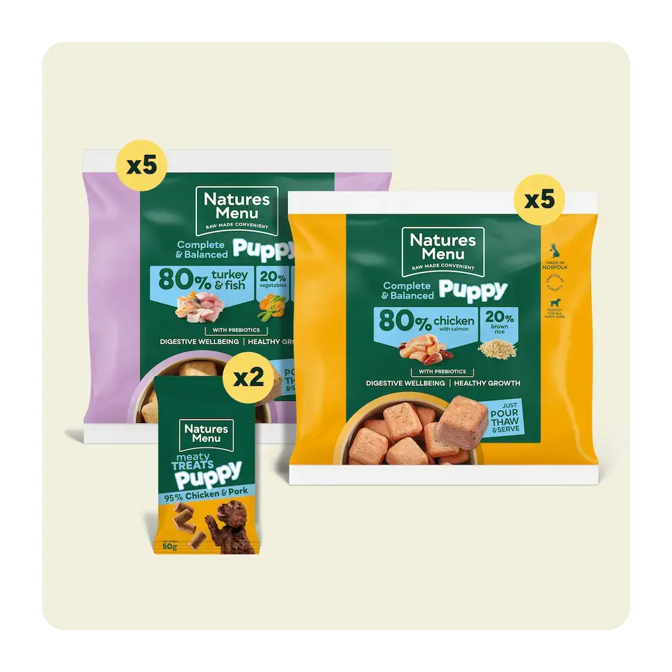 They'll get to try our most popular raw puppy meals – made with 80% real meat, healthy brown rice, fruits and vegetables – plus puppy-friendly treats for positive training sessions. Each recipe is approved by vets and free from artificial colourings and preservatives. Choose from 3 box sizes. The bigger the box, the longer it lasts – and the more variety your puppy can explore as they grow.